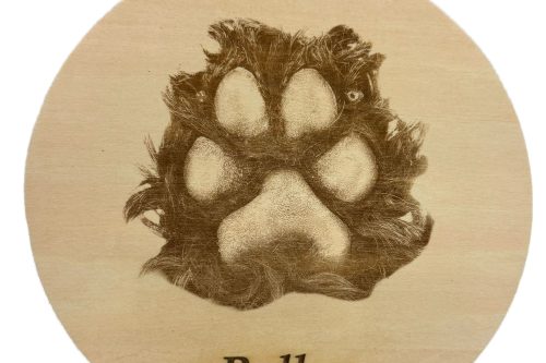 Engraved wooden paw print