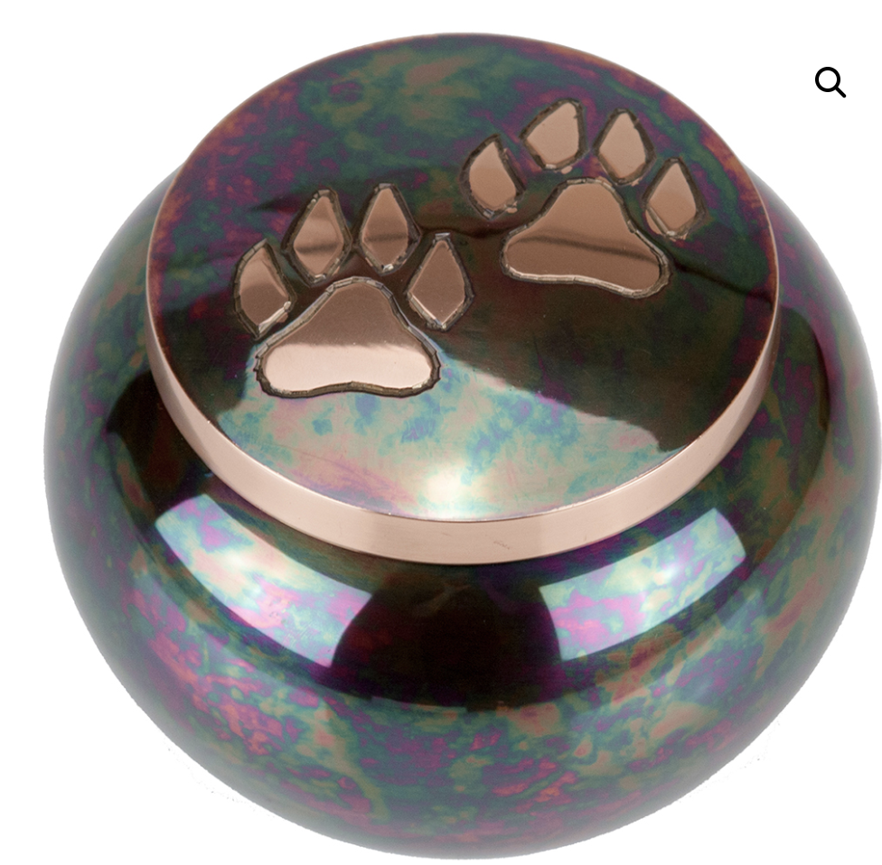 The Milano Raku paw collection features brass urns with a copper overlay and Raku finish paw print design. These memorials close securely with a threaded lid and offer a felt-lined base.